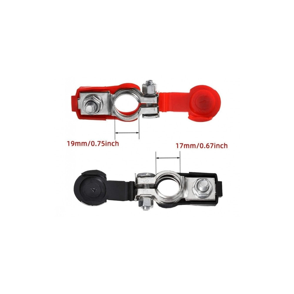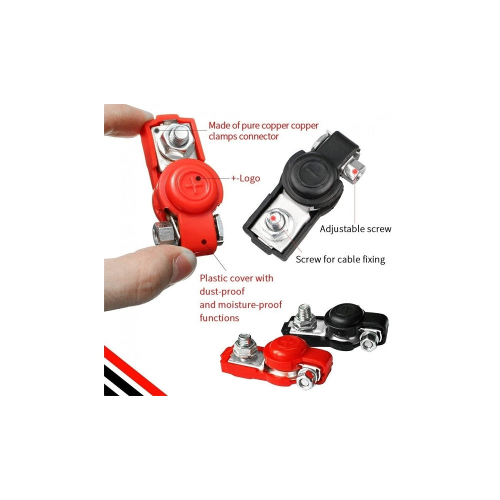 Set de 2 borne auto fabricate din aluminiu dur eloxat, proces care le oferă o rezistență sporită la coroziune și uzură. Acoperite cu cauciuc moale pentru protecție suplimentară, aceste borne asigură o conectare sigură și durabilă. Sistemul de prindere cu șuruburi auto-blocante permite montarea și demontarea rapidă. Membrana de izolație protejează atât bateria, cât și firele din jur, prevenind scurtcircuitele. Ideal pentru o conexiune eficientă și sigură a cablurilor de pornire.